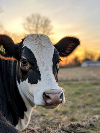 The close-up captures a cow with soft fur in warm sunlight, set against a blurred farm background, creating an elegant and peaceful rural setting.