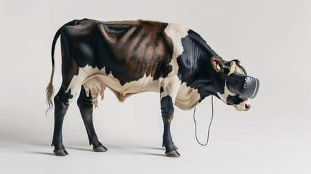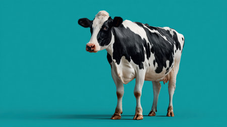Dairy cow presents its striking black and white coat against a bold teal background, highlighting the animals natural grace and beauty in a studio environment.