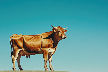 A solitary cow stands majestically in a sunlit field, surrounded by lush green grass and a clear blue sky. Ideal for agriculture and nature themes.