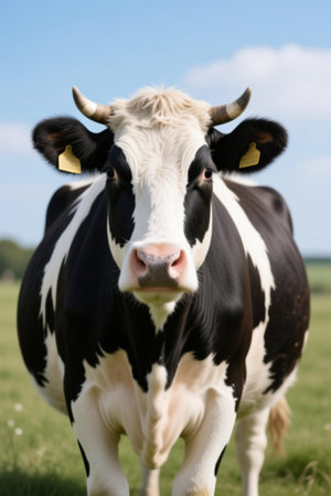 Mature black and white cow with a pink nose standing in front of a blue sky. Generative AI