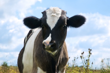 Black and white young cow over a blue sky background