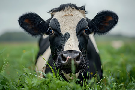 black and white cow looking at the camera on the background of the field. Generative AI