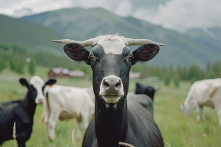Cow goat pasture in a field ecological local farm no cruelty animal safety happiness herd flock milk eco environment sustainability humanity agriculture green forest meadows mountains grass land