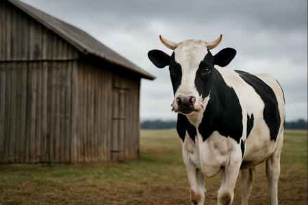 AI generated image of a cow standing near a wooden barn with overcast skies and soft lighting. A clean, calm rural scene highlighting natural textures and atmosphere.