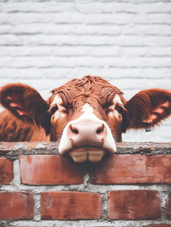 Close up of a red sad cow looking out of a red brick wall
