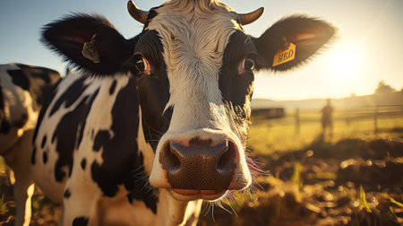 Black white pattern cow with morning light. Generative AI.