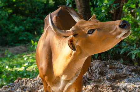 close up of Banteng or Bos javanicus, Red bull in the nature
