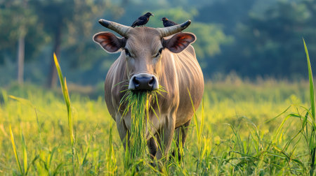A bull standing majestically, grazing on the lush grass before it, epitomizing the tranquility and natural grace of farm life.