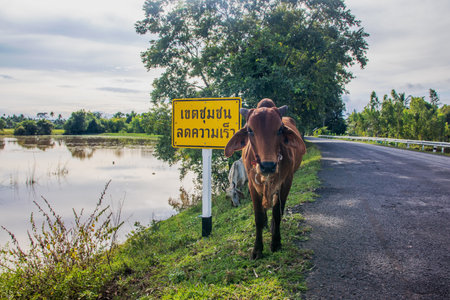 a cow walk on street passing rice field