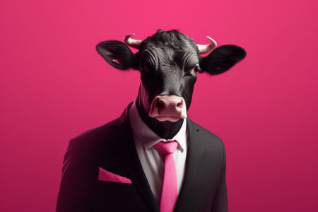 A cow wearing a black suit and a pink tie, standing against a pink background. The image is humorous and surreal, conveying a sense of irony and playfulness.