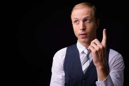 Portrait of young man on black background with hard light. He has a serious expression on the face like thinking or meditating. He has short hair but natural and a little beard and brown eyes.