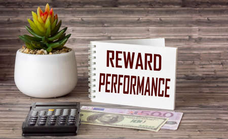 Business concept. Notepad with the text REWARD PERFORMANCE sheet of white paper for notes, calculator, cactus and banknotes of dollars and euros on a wooden background