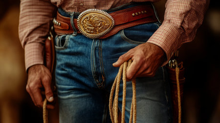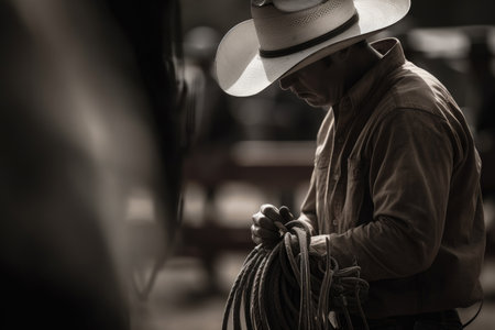 rodeo contestant with cowboy hat and rope in hand, getting ready for the next event, created with generative ai