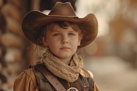 Portrait of a young child in cowboy attire looking intently into the distance, with a rustic backdrop