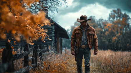 lone cowboy walks thoughtfully his ranch surrounded golden autumn foliage as sky looms grey clouds capturing moment introspection.