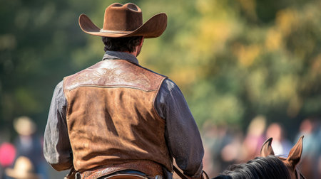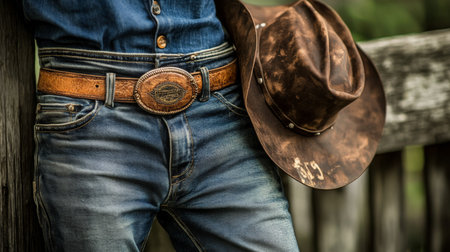 Cowboy hat resting on a denim-clad cowboy in a rustic outdoor setting