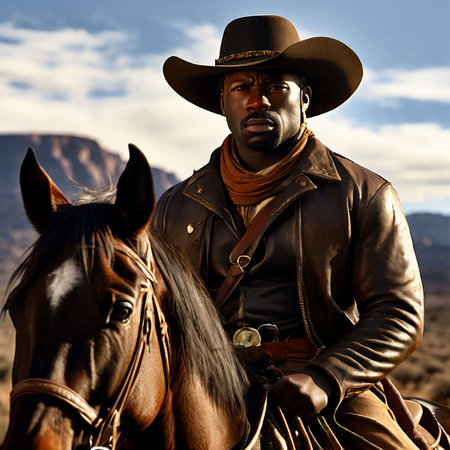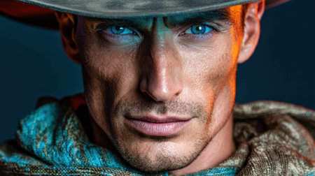 A cowboy poses confidently, showcasing his piercing blue eyes and strong facial features. The dramatic lighting enhances his rugged look, emphasizing the textures of his attire and hat.