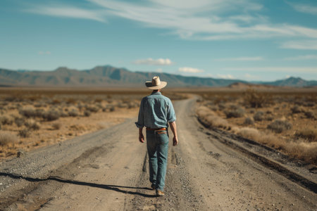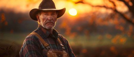 Cowboy with a weathered hat and denim jacket stands on a sunny rural path. The golden hour light casts a warm glow, creating a nostalgic, cinematic Western atmosphere