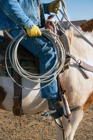 Cowboy preparing for a rodeo event holding lassos in a rustic barn setting
