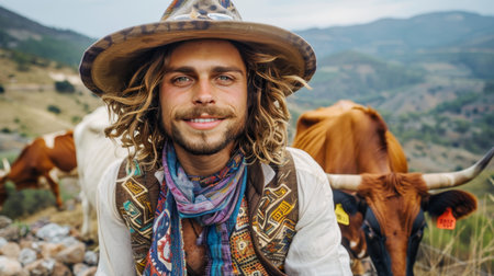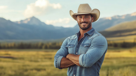 A man dressed as a cowboy stands with crossed arms against a breathtaking backdrop of mountains and open fields. The warm light highlights his smile and attire