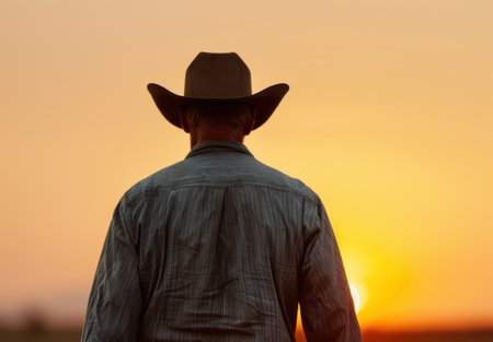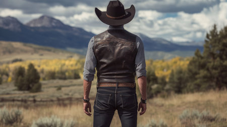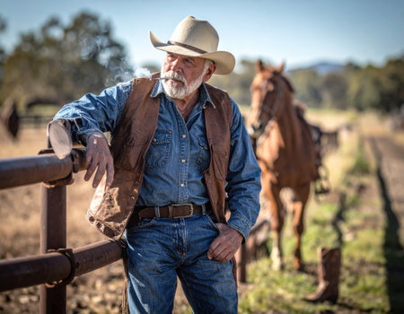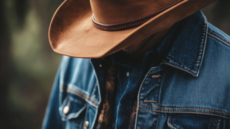Cowboy in a denim jacket and hat during a quiet moment outdoors in the countryside