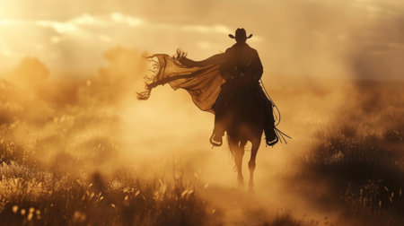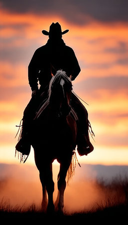 A captivating silhouette of a lone cowboy riding across an open landscape at sunset. The dramatic sky, dust clouds, and expansive terrain evoke a sense of adventure and freedom.