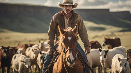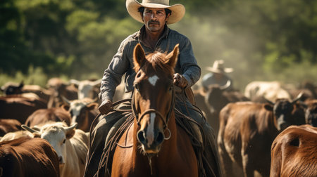 Cowboy herding cattle at sunset on a ranch in the countryside