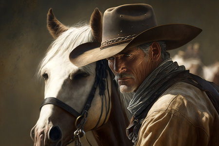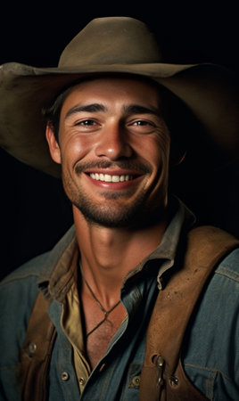An AI generated illustration of a confident adult male with a cowboy hat and a full beard, smiling happily