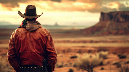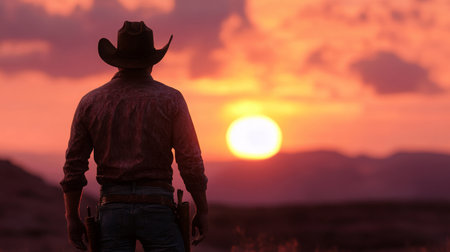 Cowboy watching a vibrant sunset over the desert landscape in the evening
