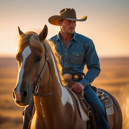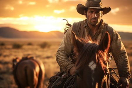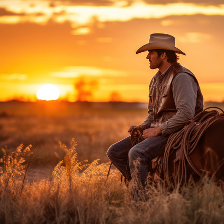 Cowboy on horseback in the field at sunset. Western lifestyle.