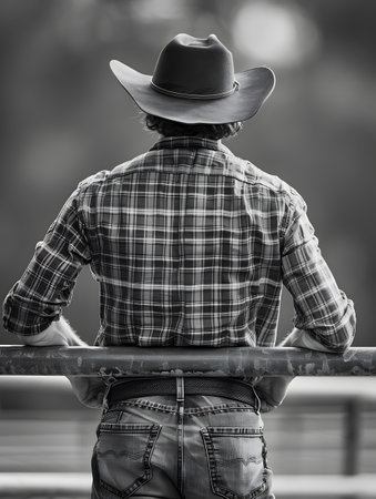 Monochrome image of a cowboy in dress shirt and fedora hat leaning on a railing