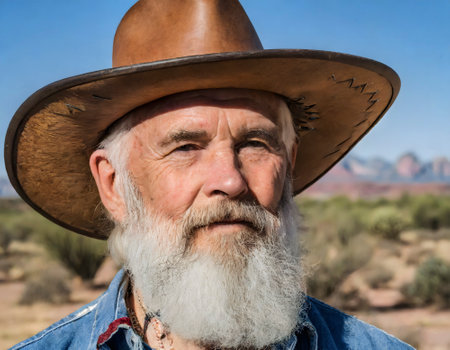 Old cowboy. An elderly man in a cowboy hat. Heroic image of a gray-haired man close-up. Gray bear. Dramatic fictional story. AI generated