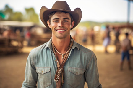 Portrait of smiling cowboy looking at camera while standing at rodeo