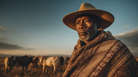 African Cattle Herder in Traditional Attire with Grazing Cows at Sunrise