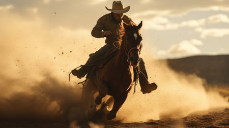 Cowboy Riding a Horse Through a Dusty Landscape at Sunset. High quality photo