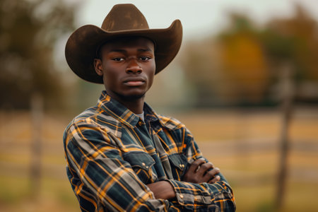 A man wearing a cowboy hat is standing confidently in front of a rustic wooden fence. He appears to be surveying his surroundings, exuding a sense of ruggedness and determination.