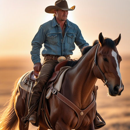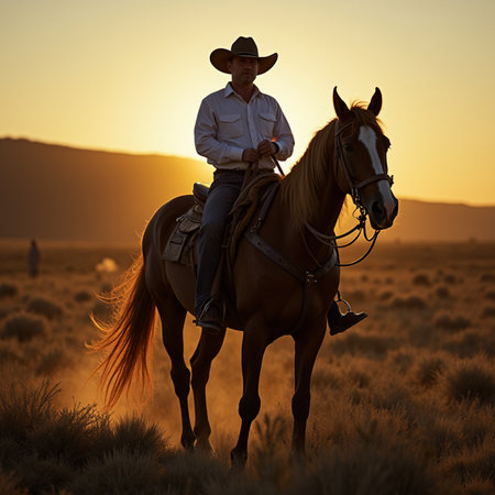 Majestic Cowboy Riding Horse Across Desert Landscape at Sunset, Capturing the Spirit of Adventure