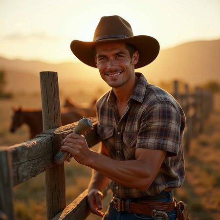 Portrait of a smiling cowboy standing by a wooden fence at sunset