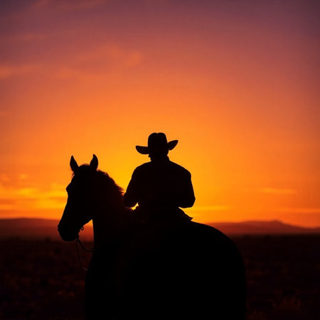 Lone silhouette cowboy riding a majestic horse across the vibrant sunset on a rugged western horizon