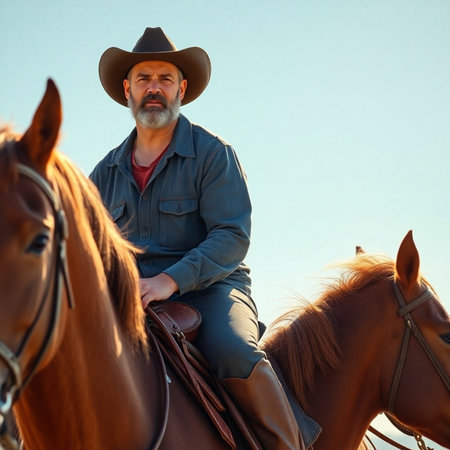 Side profile of a thoughtful rancher, surrounded by cattle and open landscape under bright blue skies.