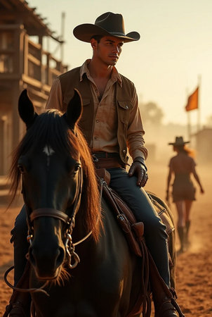 A cowboy strides confidently through a dusty western town, bathed in golden sunlight. The atmosphere reflects the classic frontier spirit, with buildings lining the street and a hint of adventure.