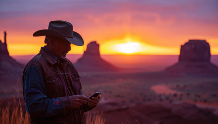 At sunset, a man wearing a cowboy hat is gazing at his cell phone under the sky