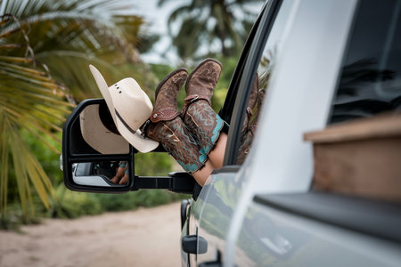 A carefree cowgirl relaxes on her Caribbean adventure, boots and hat hanging from the window, soaking up the sun and sea breeze before hitting the road for her next journey.