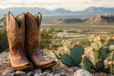 Cowboy boots standing on rocky ground beside cactus plants in desert landscape with mountains in background and clear sky.