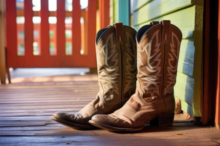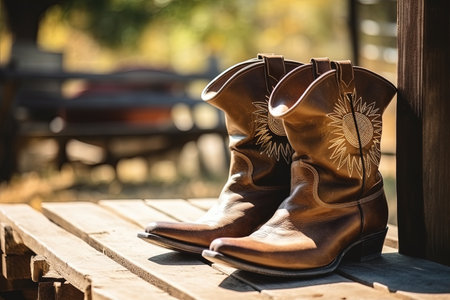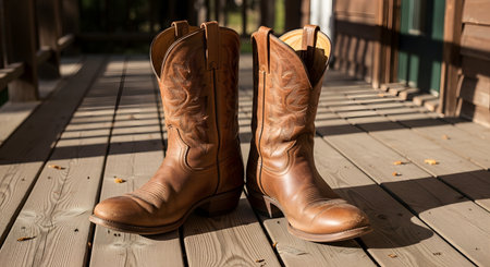 A pair of vintage leather cowboy boots rests on a rustic wooden floor in a sun-lit barn. Capturing the essence of country fashion and craftsmanship.