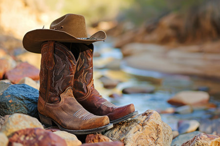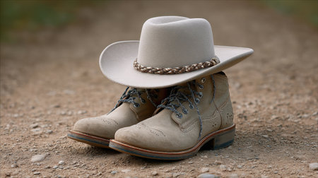 Rustic cowboy boots paired with a classic hat sit on a dusty trail, capturing the essence of outdoor adventure and Western charm in a serene landscape.