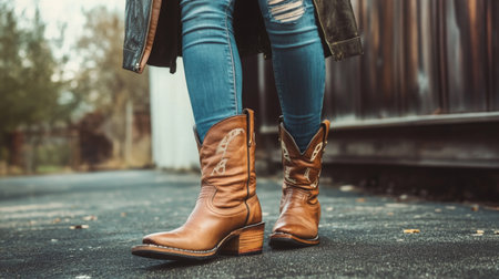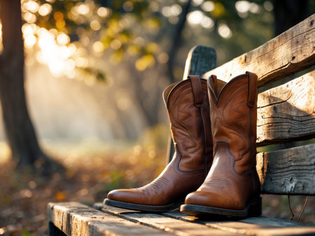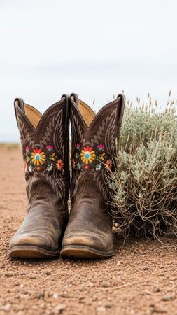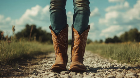 A Stylish cowboy boots on dusty trail, showcasing rugged outdoor fashion
