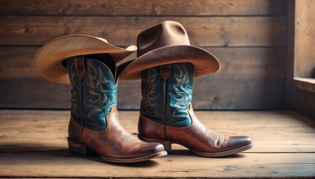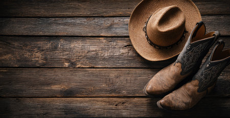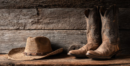 A pair of worn leather cowboy boots and a straw hat are displayed against a backdrop of aged wooden planks. The composition features warm tones, suggestive of a vintage aesthetic. This arrangement is suitable for various applications, including advertising and editorial projects where a classic, western theme is desired.