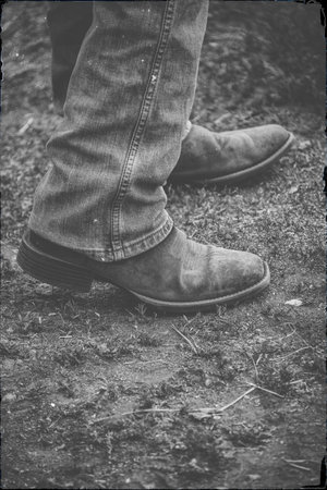 Well-worn cowboy boots and faded denim tell the story of countless miles walked across ranchland — a simple, rugged symbol of the working West.