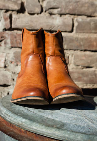 Cowboy leather boots and a pair of jeans in the stable of the ranch